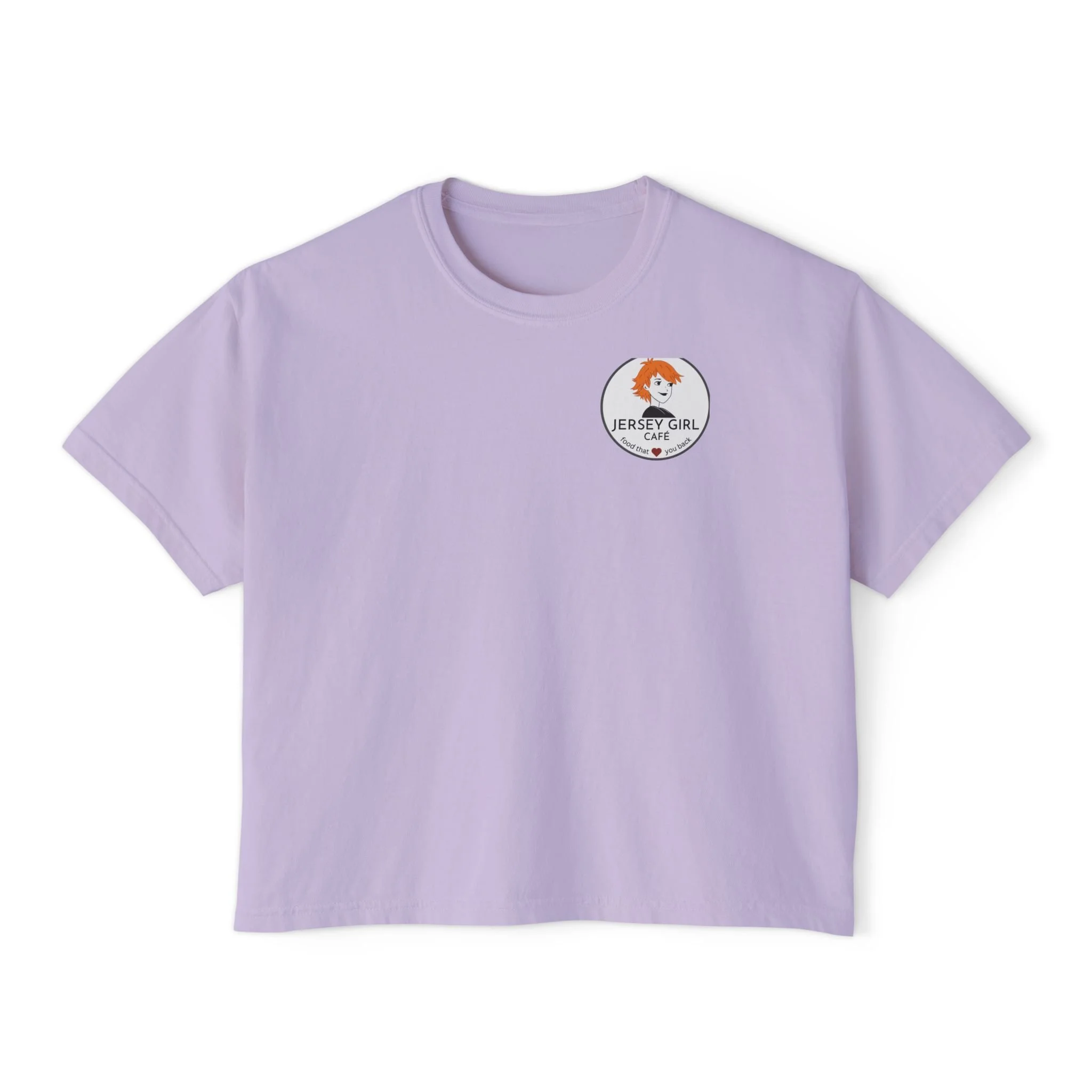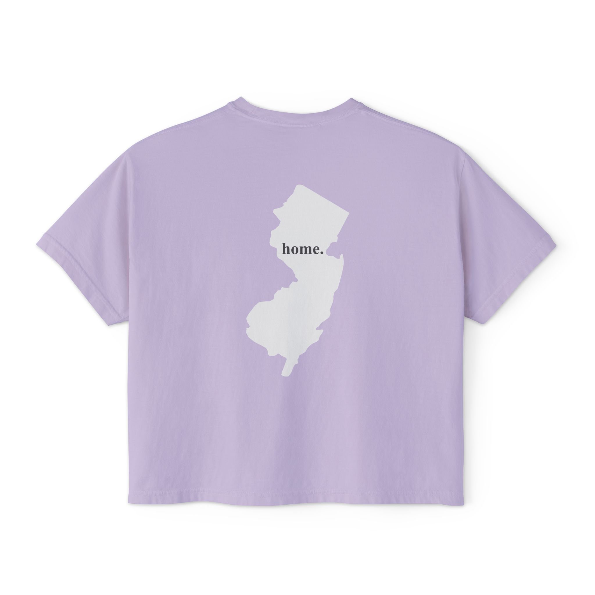 A lived-in, laid-back boxy tee that feels like coming home. The cropped, relaxed silhouette sits easy over high-waist jeans or layered under an open shirt. On the back the state silhouette reads “home.” — quiet, familiar, and quietly proud, just like Jersey girls that wear this shirt.